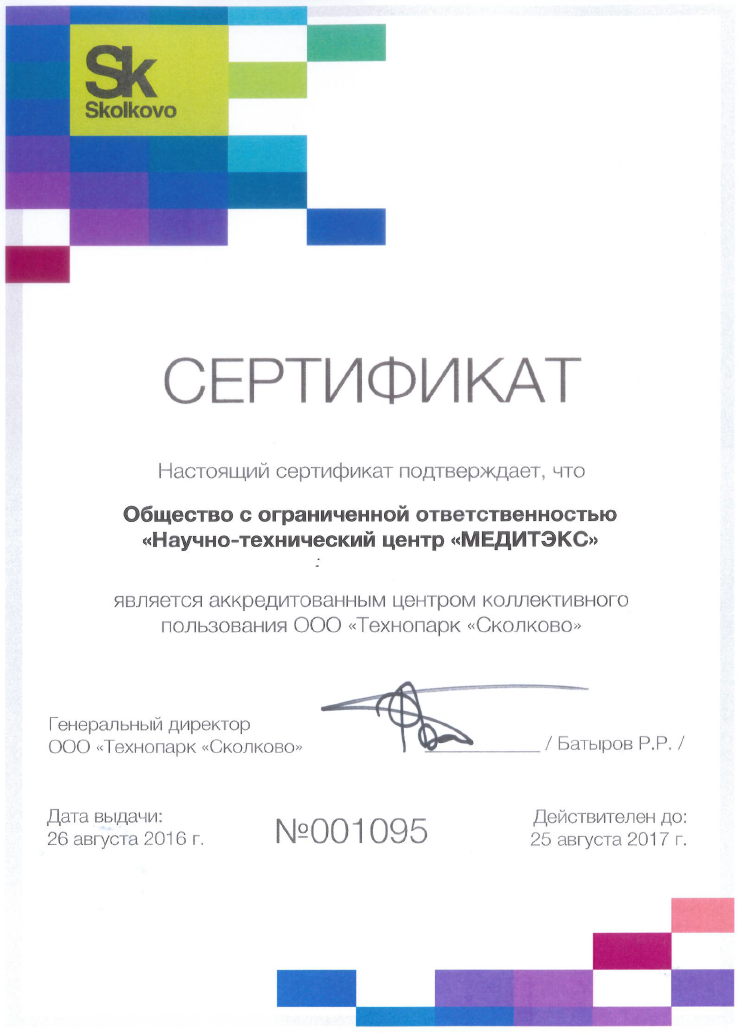 26 августа 2016 года Научно-технический центр «Медитэкс» получил аккредитацию в качестве Центра коллективного пользования Технопарка «Сколково».